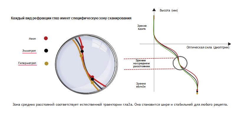 Локальная проработка средней зоны линз для расширения полей зрения для средних дистанций, без ухудшения зрения вблизи и вдаль.